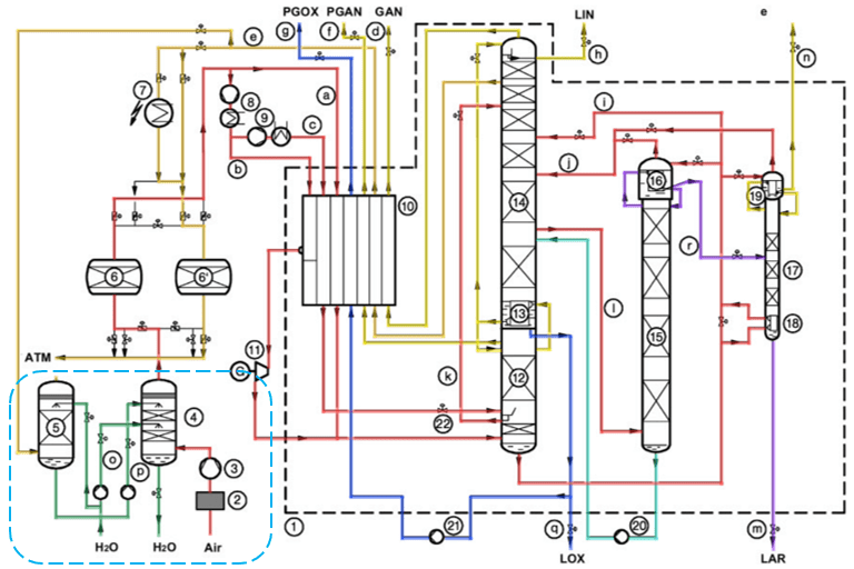 My superior used to say, “During the learning process, it is better to color the process flow diagram based on the fluid service,” and I still hold his advice up to this day. In a simplified way, the process consists of 2 main parts: warm section (pre-treatment) and cold section (rectification and liquefaction). We will look together at the process step-by-step.